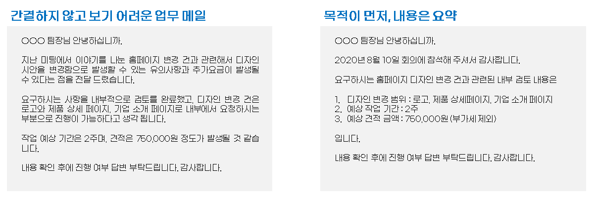 간단하게 문장의 순서만 변경하고 내용만 요약해도 메일의 내용을 파악하는데 소요되는 시간이 줄어들고 효율을 높일 수 있습니다.