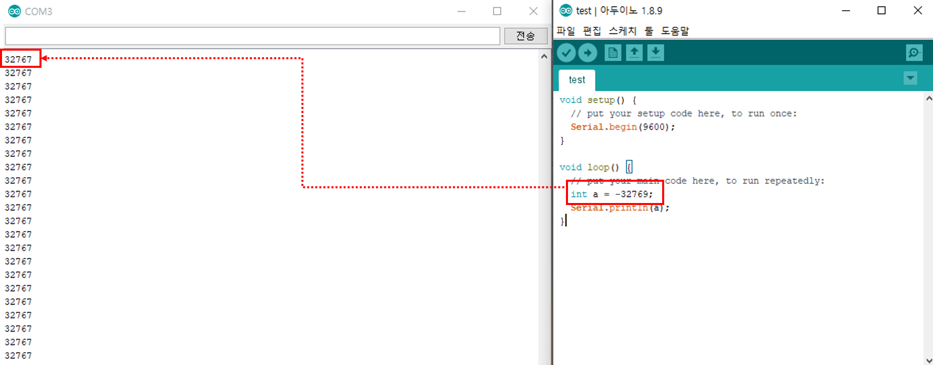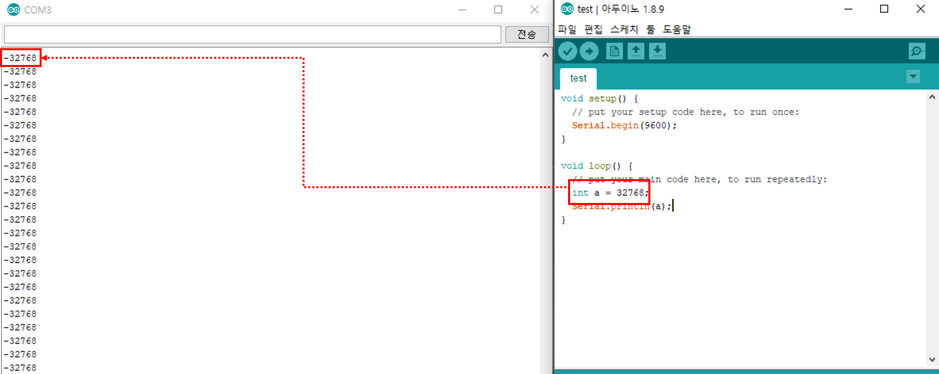 사용자가 32,768의 값을 int형 변수에 선언하게 된다면 값이 -32,768로 처음 변수를 선언할 때 입력한 값과 다르게 표시되는것을 확인할 수 있다.