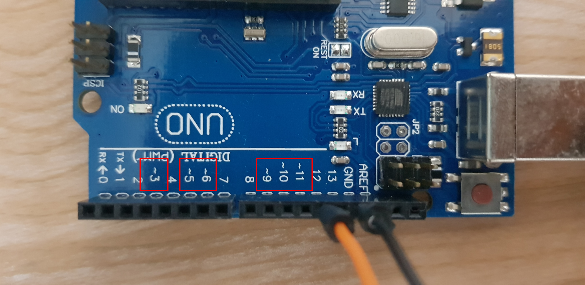 아두이노 우노 보드에서는 PWM 출력을 사용할 수 있는 출력핀이 정해져 있다. 보드를 살펴보면 ~모양이 숫자 앞에 적혀 있는 핀들을 확인할 수 있는데, 숫자 앞에 이런 ~ 무늬가 있는 핀만 사용할 수 있다.