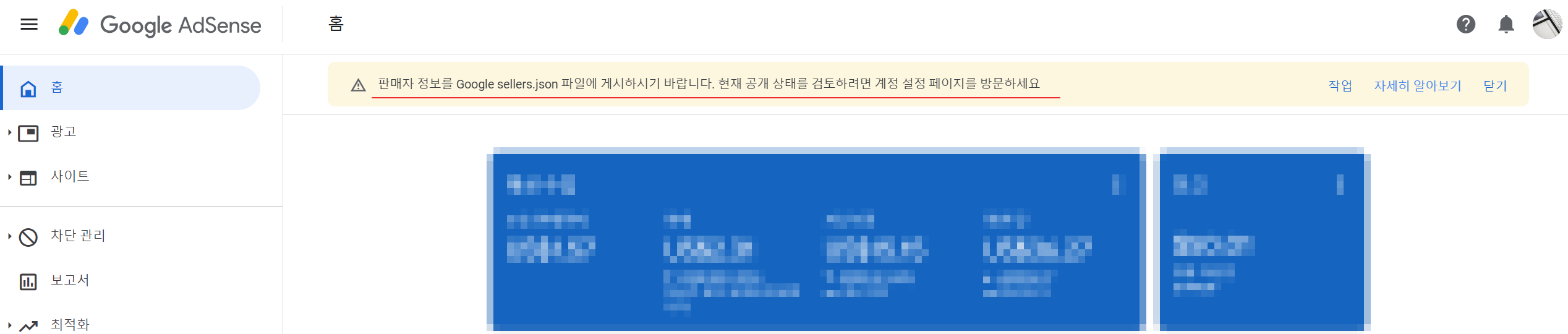 예 바로 저 메시지인데요. 이전에도 Ads.txt 인가? 어떻게 해결하는지도 모르겠지만, 어떻게든 해결해보라는 애드센스 쪽의 알림을 보고 맨땅에 해딩을 하면서 다양한 해결방법을 찾다 결론은 그냥 둬도 크게 상관은 없다는 기적과도 같은 결론을 내린적이 있어서인지 알림을 보자마자 덜컥 겁부터 났습니다.