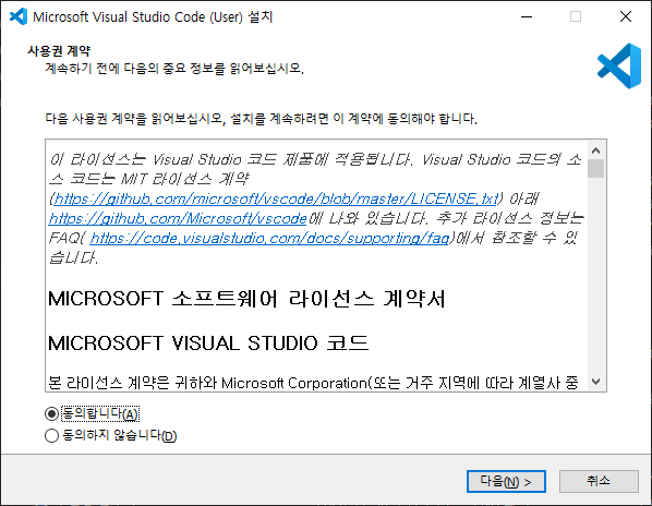 처음으로 사용권 계약 창에서는 '동의합니다' 버튼을 눌러 '다음'을 선택해서 진행해주시면 됩니다.