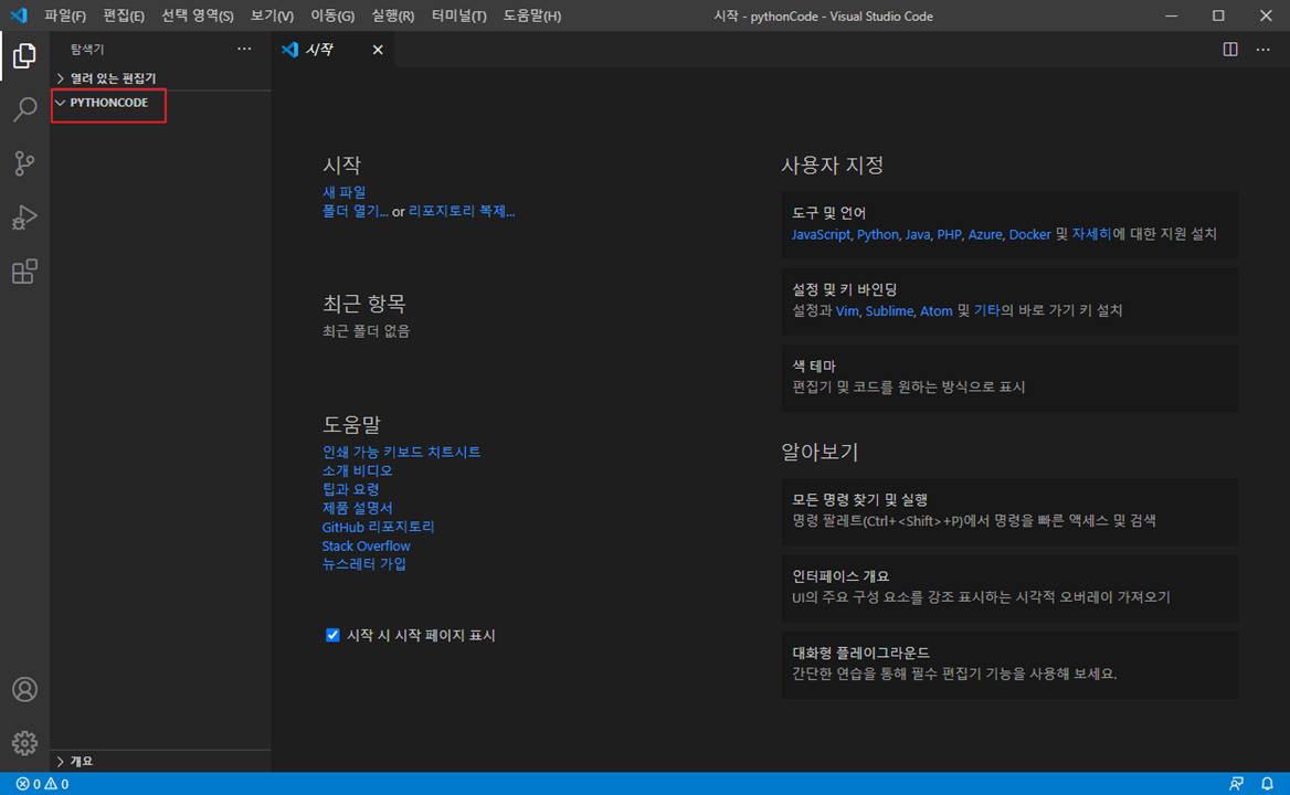 저는 바탕화면에 만들어두었던 'pythonCode'라는 폴더를 선택해서 앞으로의 작업을 진행할 폴더로 지정하겠습니다.