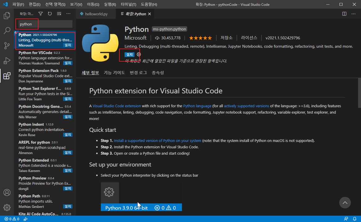 이동해서 'python'을 검색해서 확장 프로그램을 설치해주겠습니다.