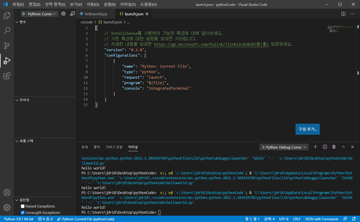 여기서 실행 및 디버그 버튼을 클릭해주시면 아래와 같은 launch.json 파일이 생성되는데 이후에는 디버깅 시작 버튼만 눌러도 python file을 선택하지 않고 자동으로 python으로 프로그램을 실행해주는 파일입니다.