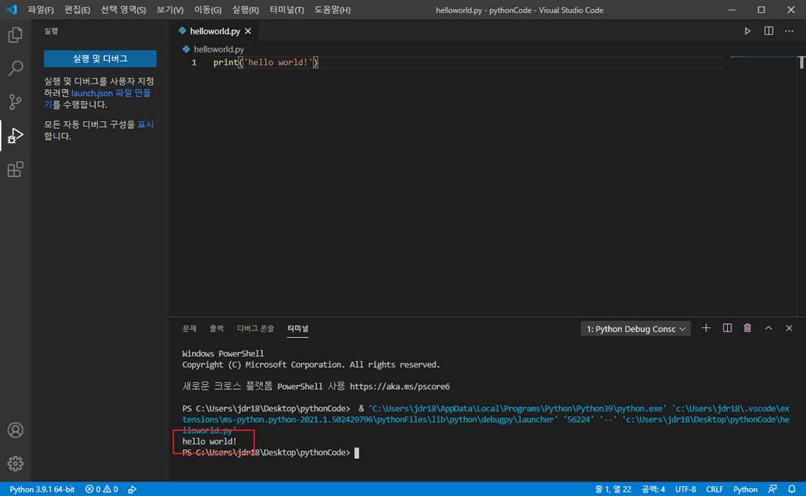 처음에 파이썬 프로그램도 설치를 완료했고 파이썬을 배우기 위한 개발환경인 Visual Studio Code 프로그램도 설치를 마쳤고 사용하기 편하게 한글로 설정 변경도 완료했습니다.