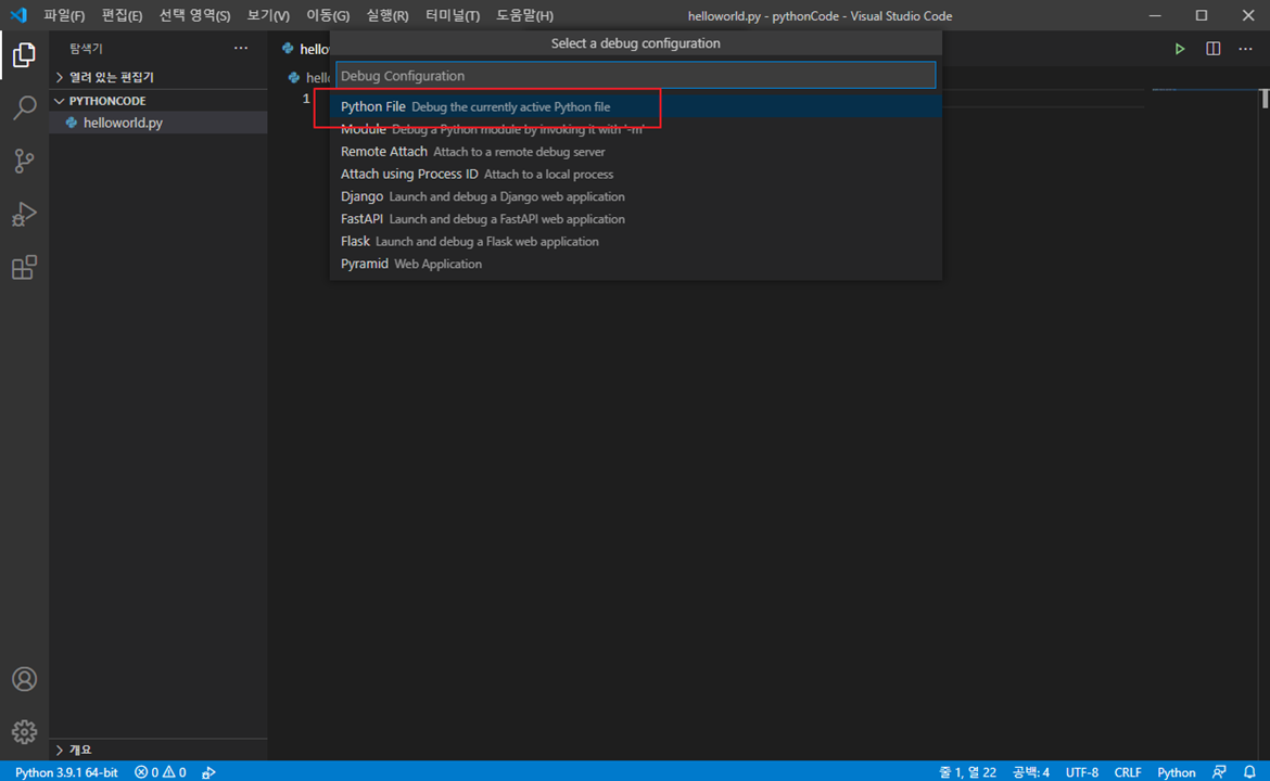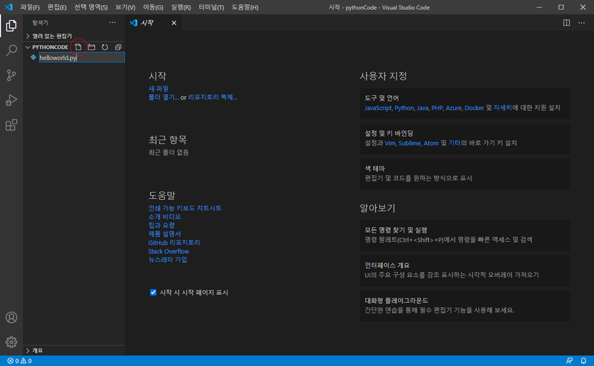 새롭게 생성하는 파일의 이름은 'helloworld.py'라고 지정하겠습니다.