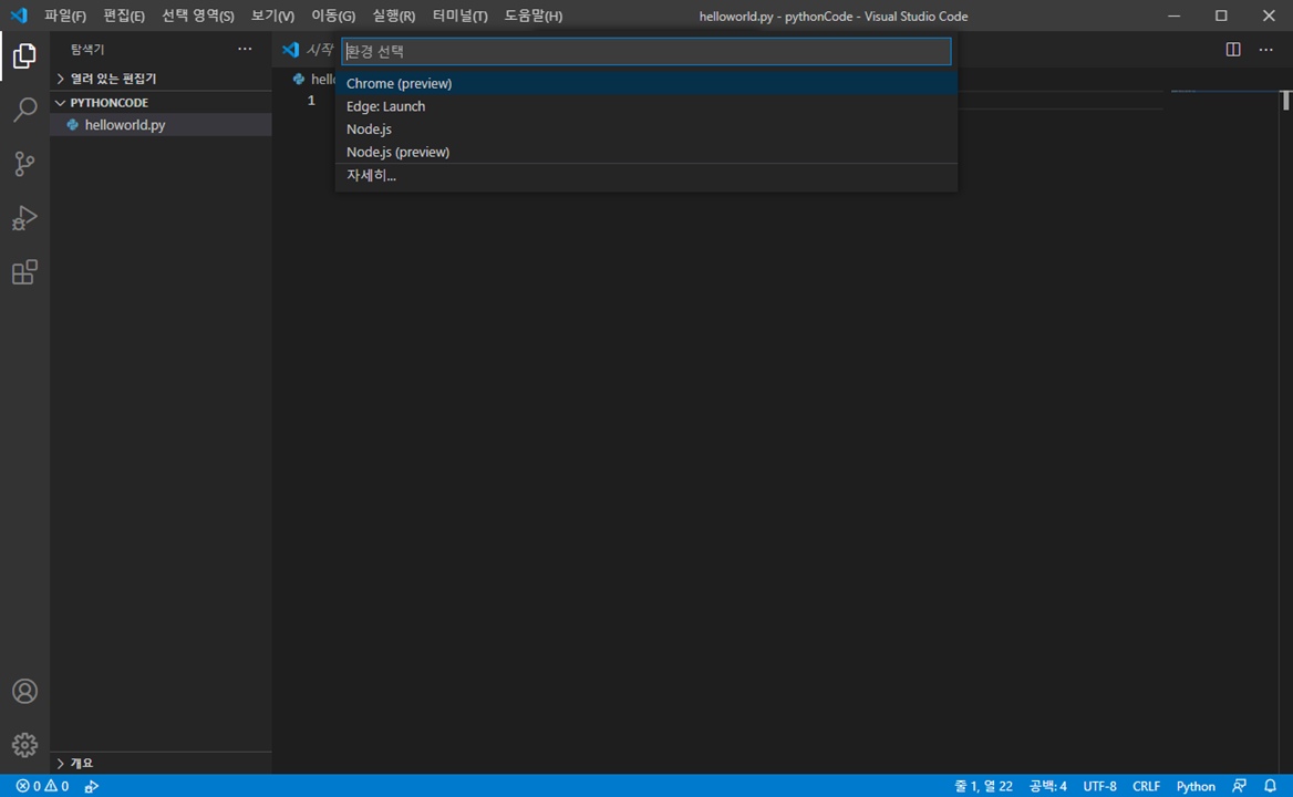 여기에 보면 우리는 파이썬 프로그램 코드를 입력하였고 파이썬으로 실행을 시키고 싶은데 눈을 씻고 찾아보아도 '파이썬'이나 'python'이라는 단어를 찾을 수 없습니다.