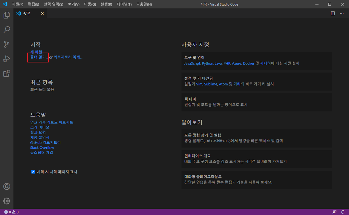 처음 프로그램을 실행하면 이전 시간에 설정한대로 익숙한 한글로 프로그램이 실행되고 빨간색으로 네모되어 있는 '폴더 열기' 버튼을 눌러서 앞으로의 코드를 작업할 공간을 찾아주시면 되겠습니다.