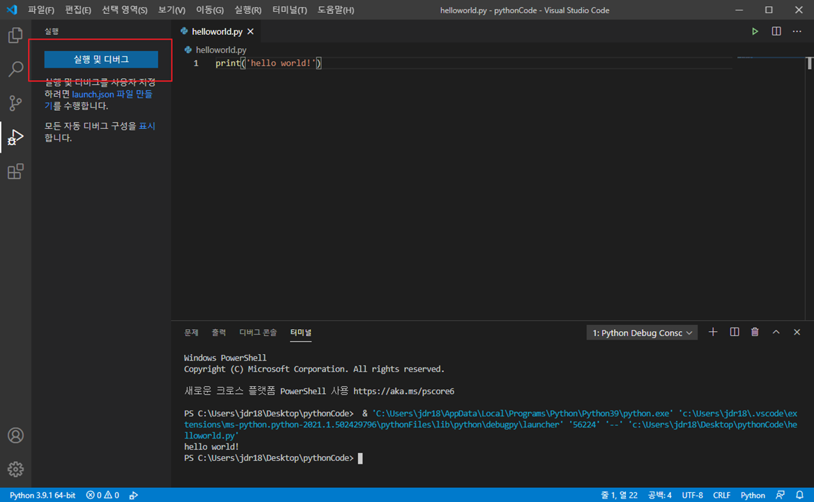 처음에 파이썬 프로그램도 설치를 완료했고 파이썬을 배우기 위한 개발환경인 Visual Studio Code 프로그램도 설치를 마쳤고 사용하기 편하게 한글로 설정 변경도 완료했습니다.