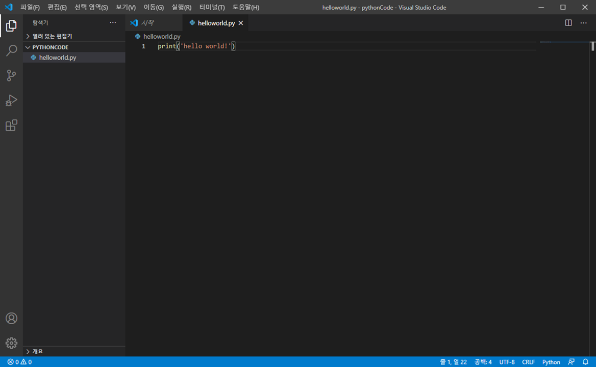그래서 저 역시도 파이썬을 시작하는 첫 예제로 Hello world 라는 문구를 출력하는 예제를 진행해보겠습니다.