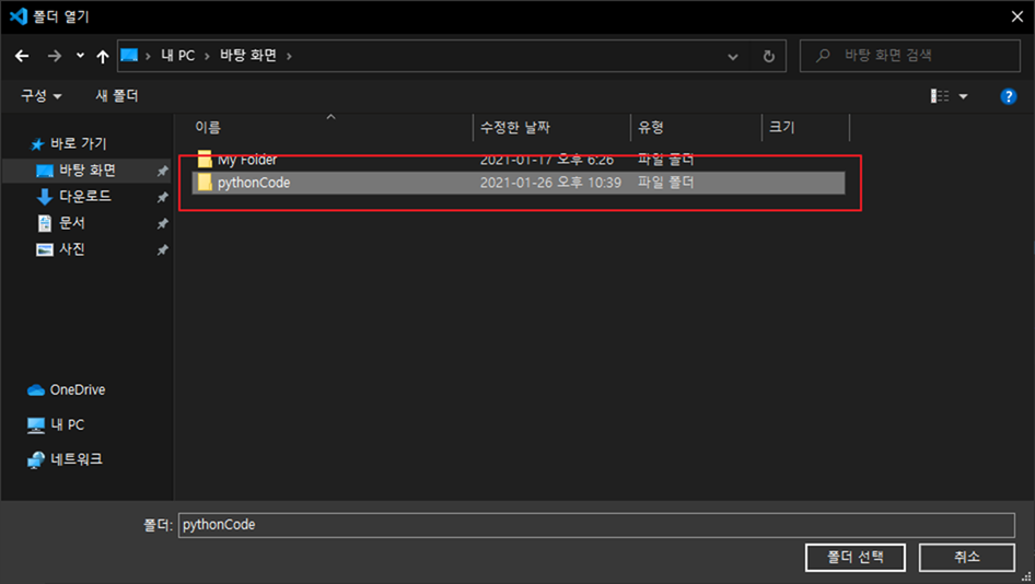 저는 바탕화면에 만들어두었던 'pythonCode'라는 폴더를 선택해서 앞으로의 작업을 진행할 폴더로 지정하겠습니다.