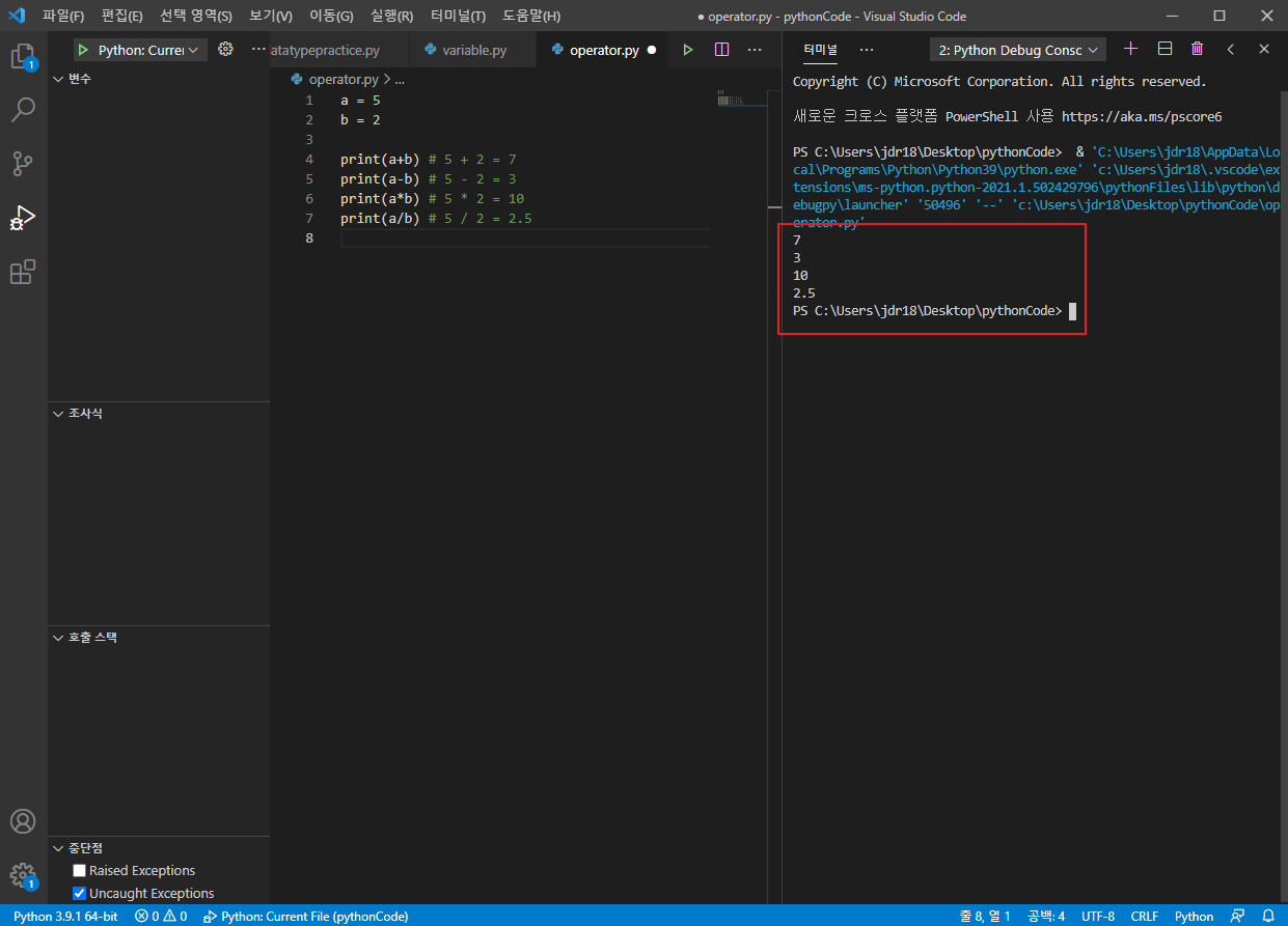 이렇게 쉽게 예상할 수 있듯이 우리가 알고 있는 덧셈, 뺄셈, 곱셈, 나눗셈의 결과가 그대로 출력이 되는 것을 볼 수 있습니다.