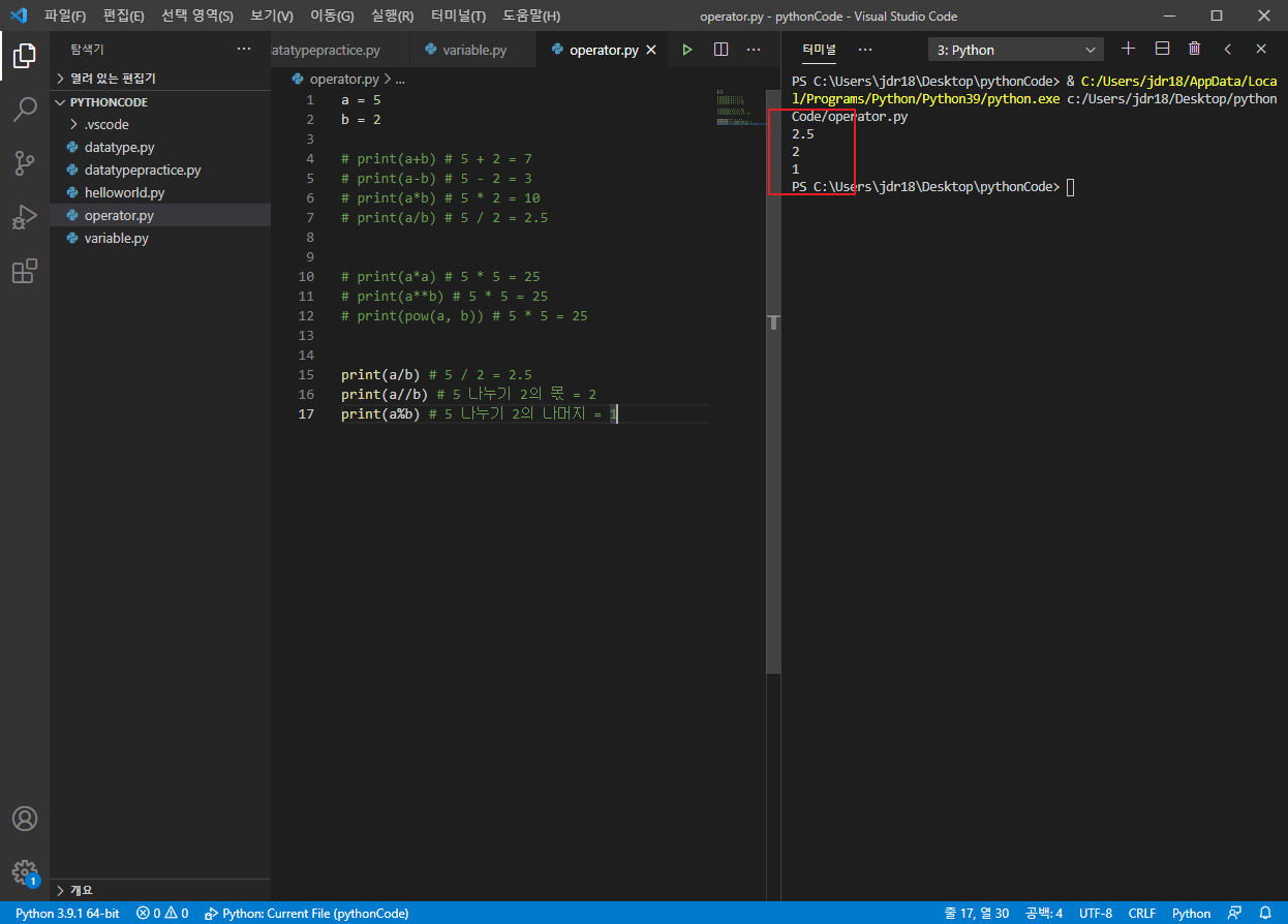 그냥 일반적인 나누기 연산자를 사용하면 5에서 2를 나누면 2.5의 값이 나타납니다. 소수점까지 모두 계산해서 값을 구하게 되는 것이죠.