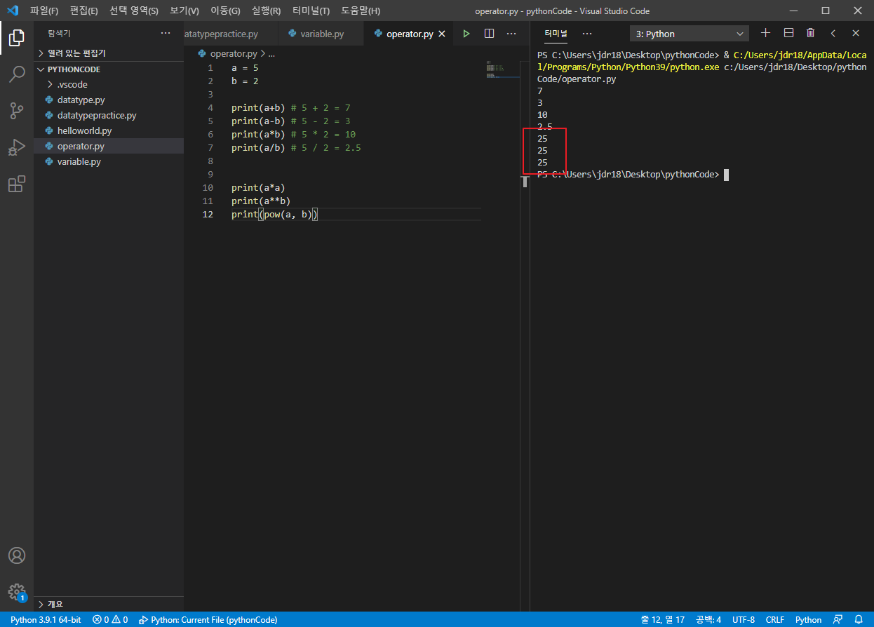 '//' 연산자는 숫자를 나누고 난 뒤 몫의 값만 구하는 연사자이며, '%' 연산자는 나눈 뒤에 나머지 값을 구하는 연산자입니다. 역시 예제를 통해서 결과를 간단하게 확인해보겠습니다.