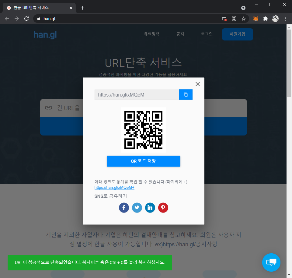 그러면 1~2초 뒤에 단축 URL이 표시가 되고 해당 URL이 저장된 QR코드까지 확인할 수 있습니다.