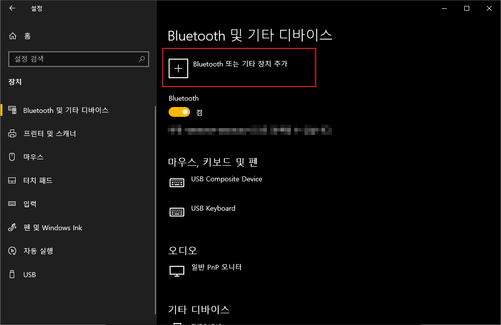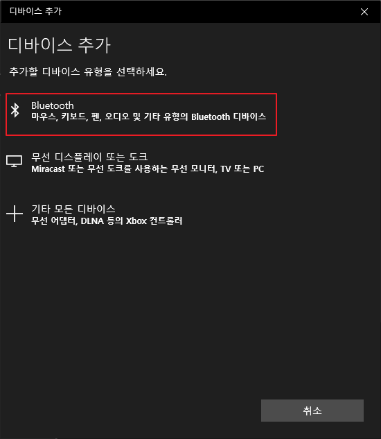 장치를 누른 뒤에 "Bluetooth 또는 기타 장치추가" 버튼을 눌러주시면 아래와 같은 창이 나타나게 됩니다.