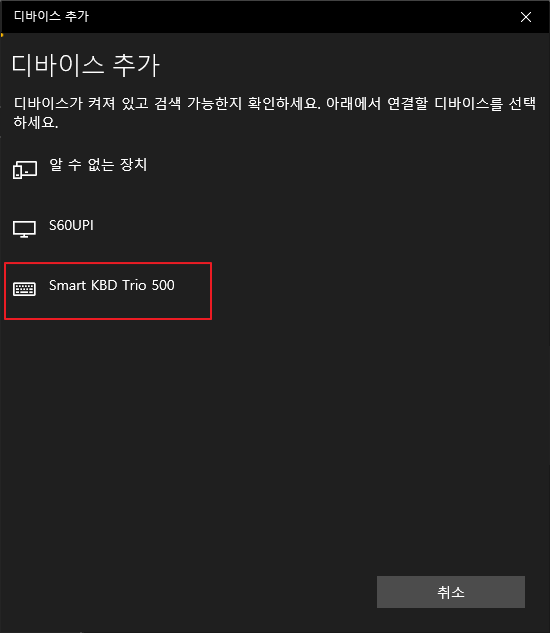 그러면 블루투스 기기를 찾는 곳에 트리오 500을 찾을 수 있습니다.