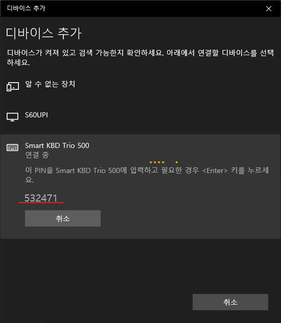 해당 버튼을 누르면 6가지 숫자가 나오고 키보드에서 해당 숫자를 입력하고 Enter 키를 누르면 연결이 완료됩니다.