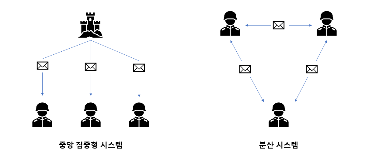 그 중 비잔틴 장군 문제는 다음과 같이 중앙 집중화 된 시스템에서는 중앙에서 내려오는 명령을 받아 수행하면 되지만, 분산화된 시스템에서는 각 장군들이 동등한 권한과 역할을 가지게 된다는 점에서 발생하는 문제입니다.
