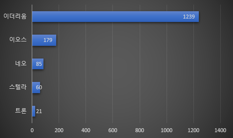 글로벌 20위권 내 블록체인 시스템에서 디앱수의 현황을 살펴볼 수 있습니다. 이더리움은 전통의 강자로 압도적인 디앱 보유량을 통해 플랫폼 활성화를 진행하고 있으며, 이후 이더리움에서 단점으로 꼽히고 있는 확장성과 처리속도를 개선한 이오스, 트론 등의 플랫폼이 이더리움을 개선해서 현재 시장을 장악하기 위해 빠른 속도로 디앱을 증식시키고 있습니다.