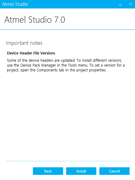 마지막으로 중요 공지 또는 메모라 나오는 대화상자가 표시가 되는데, 간략하게 해석해보면.... 장치의 해더가 업데이트 되고 다른 버전을 사용하고 싶다면 장치의 Pack Manager를 사용해 버전을 설정하라는 의미인데 정말 1도 이해가 되지 않는 말인 것 같습니다. 기회가 된다면 어떤 의미인지 찾아와서 설명드리곘습니다.