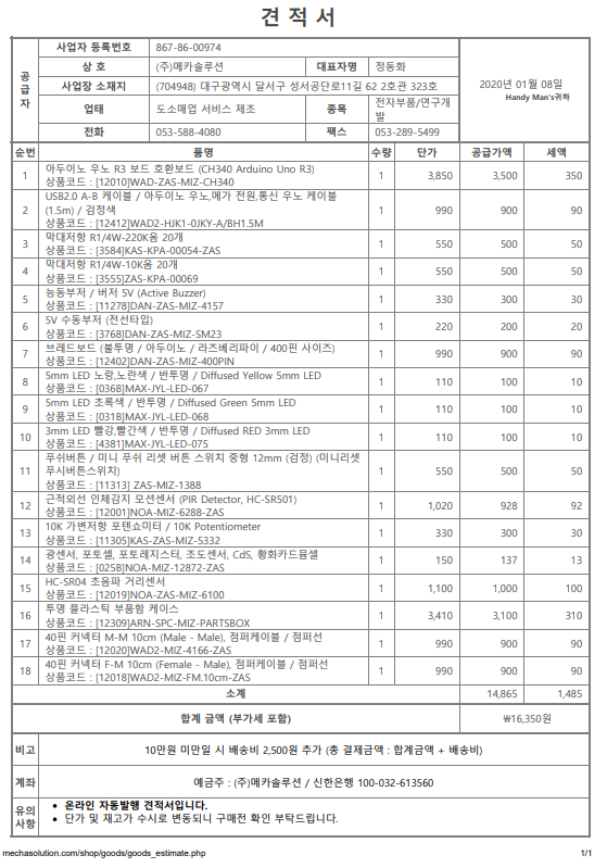 저는 기본적으로 아두이노 키트나 부품을 구입하기 위해 생각했을때 메카솔루션 사이트를 굉장히 자주 이용합니다.