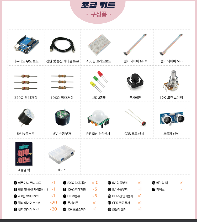 이번 포스팅에서는 비교대상을 제가 구매해봤었던 '처음봐, 아두이노 종결 키트 (초급편)'을 기준으로 비교해보겠습니다.
