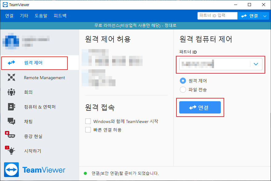 여기서 원격접속을 할 때 '원격접속' 탭을 누른 뒤에(아마 실행하고 처음 페이지일 것입니다.) 오른쪽 '파트너 ID'에 내가 원격접속을 하고 싶은 PC의 ID를 입력하고 연결 버튼을 클릭해주시면 됩니다.