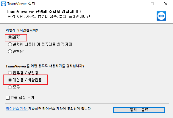 제일 처음 있는 질문인 '어떻게 하시겠습니까?'에서 기본적으로 선택되어 있는 '설치' 옵션으로 가만히 두시고, 다음 'TeamViewer를 어떤 용도로 사용하시기를 원하십니까?' 라는 질문에 우리는 오직 '무료'로 제공되는 '개인용/비상업용'을 선택해서 설치를 진행해주시면 됩니다.