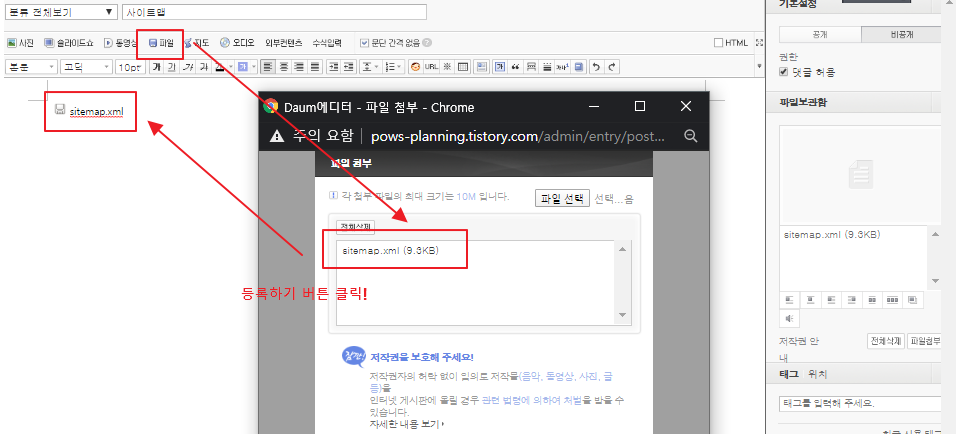 그리고 글쓰기를 누르게 되면 정말 전통의 미가 강조된 글쓰기 창을 볼 수 있는데, 여기에 파일 버튼을 눌러 사이트맵을 추가한 다음에 등록 버튼을 누르게 되면 예전 에디터 창에 sitemap.xml 파일이 추가되는 것을 확인할 수 있습니다.