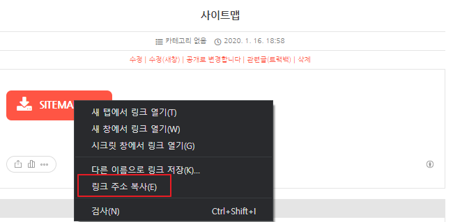 추가된 사이트맵 파일 위에서 마우스 우클릭을 한 다음에 '링크 주소 복사' 버튼을 눌러주시면 됩니다.