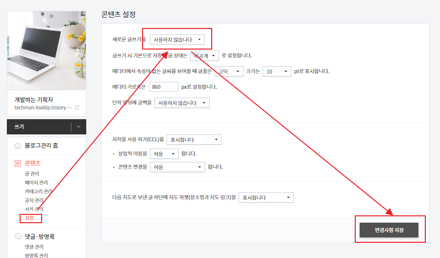 블로그 설정에서 '콘텐츠' 탭에서 '설정' 을 선택하고 그 다음에 새로운 글쓰기를 '사용하지 않습니다.'로 바꿔주신다음에 '변경사항 저장'을 눌러주시면 됩니다.