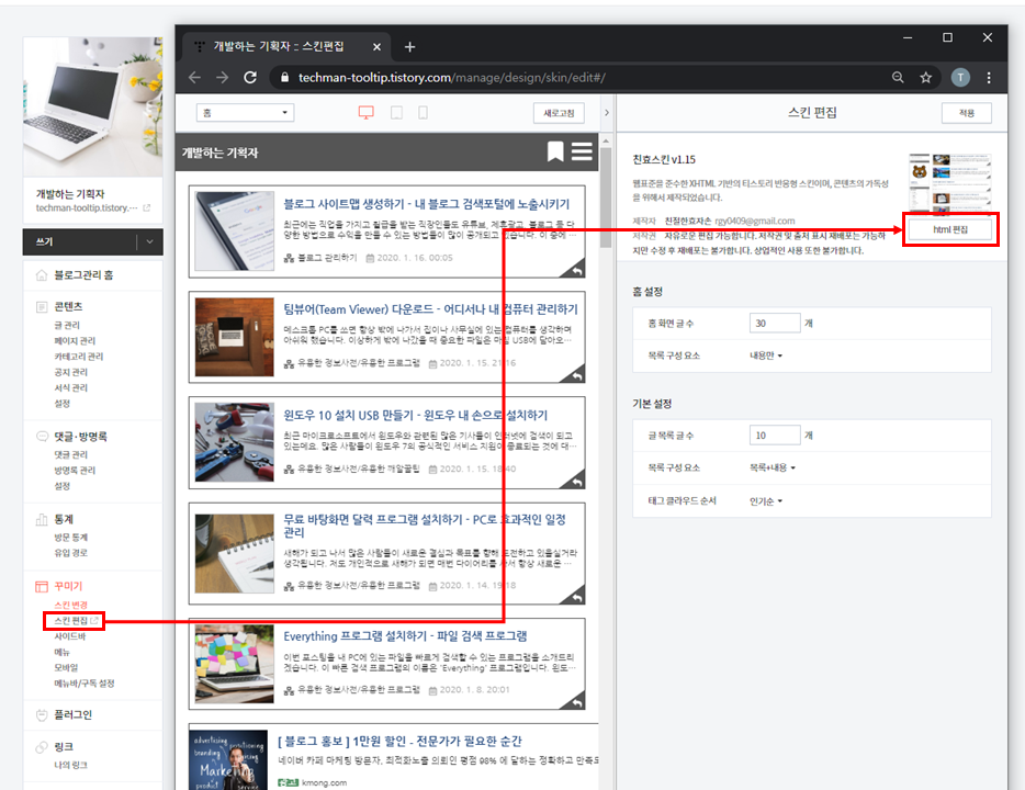 그러면 블로그로 돌아와서 블로그 설정 페이지에서 '스킨편집' 버튼을 누르고 나타나는 창에서 'HTML 편집' 버튼을 선택해주시면 됩니다.