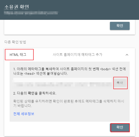 그러면 이 빨간색 네모 상자 안에 있는 정보를 아까 구글서치콘솔에 추가하면 완료됩니다.