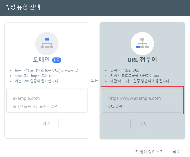 여기서 'URL 접두어'로 선택을 한 뒤에 아래 URL 입력 칸에 '티스토리 블로그 메인주소'를 입력해주시면 됩니다.