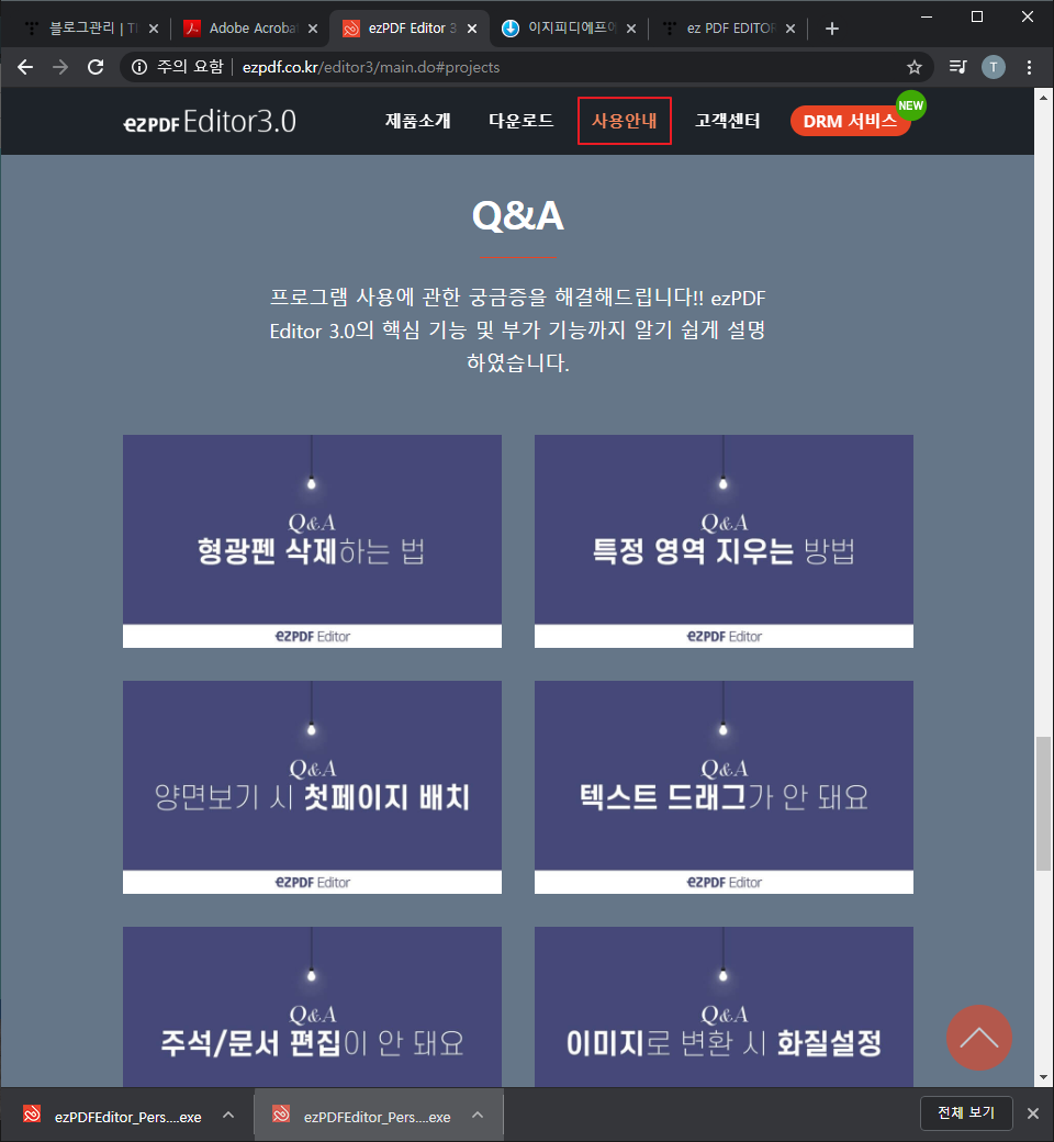공식 홈페이지에서 '사용안내' 탭을 누르면 자동으로 화면이 이동하는데, 여기에 ezPDF에서 지원하는 기능들이 소개되어 있고 각 기능을 어떻게 사용하는지에 대해서 자세하게 설며되어 있습니다.
