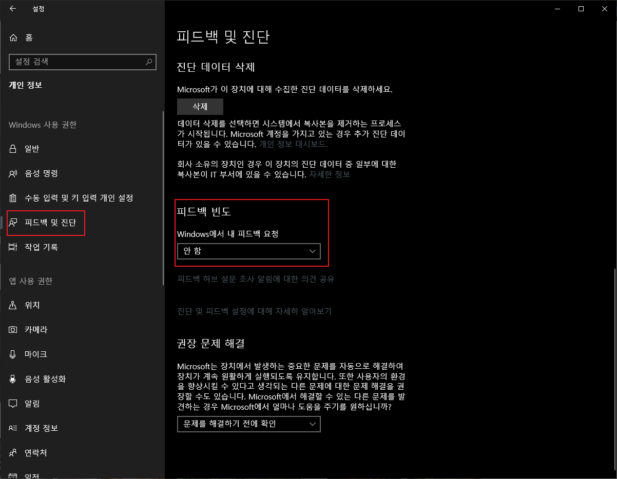 윈도우 설정으로 들어가서 '개인정보' - '피드백 및 진단' 탭으로 이동해주시면 됩니다.
