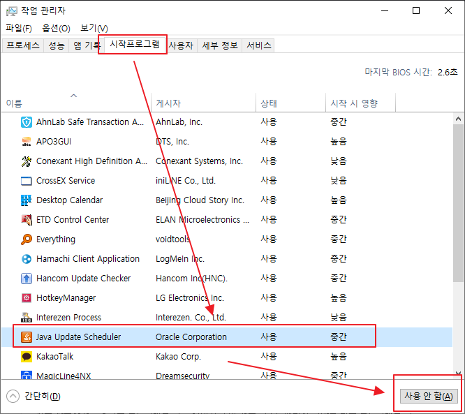 여기서 아래에 있는 프로그램 중에 내가 PC를 시작하고 나서 자동으로 켜질 필요가 없다 라는 프로그램을 선택해서 '사용 안 함' 버튼을 눌러주시면 됩니다.