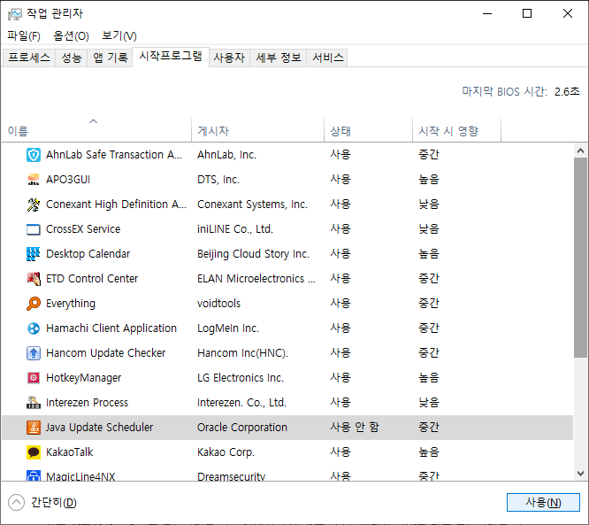 작업관리자에서 '시작 프로그램' 탭으로 이동하게 되면, 내 생각보다 많은 시작 프로그램이 있다는 점을 확인할 수 있습니다.
