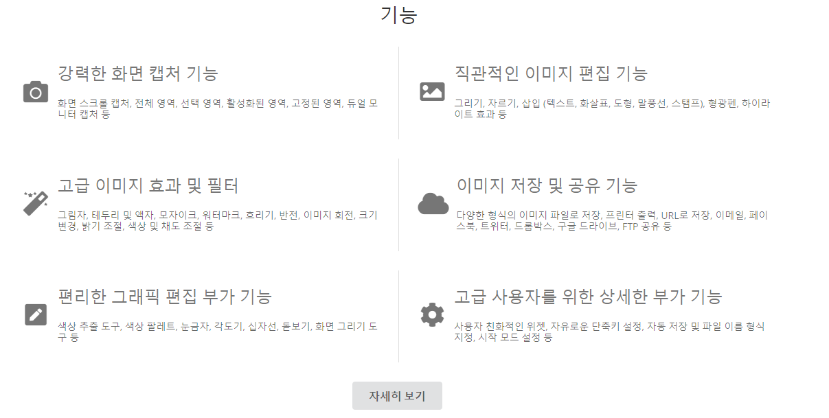 위 자세히 보기 버튼을 누르면 기능 하나하나에 대해서 조금 더 상세하게 소개된 페이지로 이동할 수 있습니다.