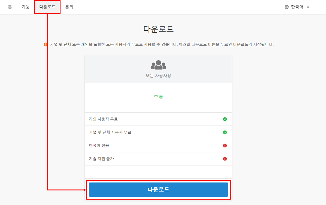 다운로드 페이지에서는 위에서 설명한 것과 같이 기업 및 단체 또는 개인을 포함한 모든 사용자가 무료로 사용할 수 있다 라는 문구가 보이고 아래 다운로드 버튼을 볼 수 있습니다.