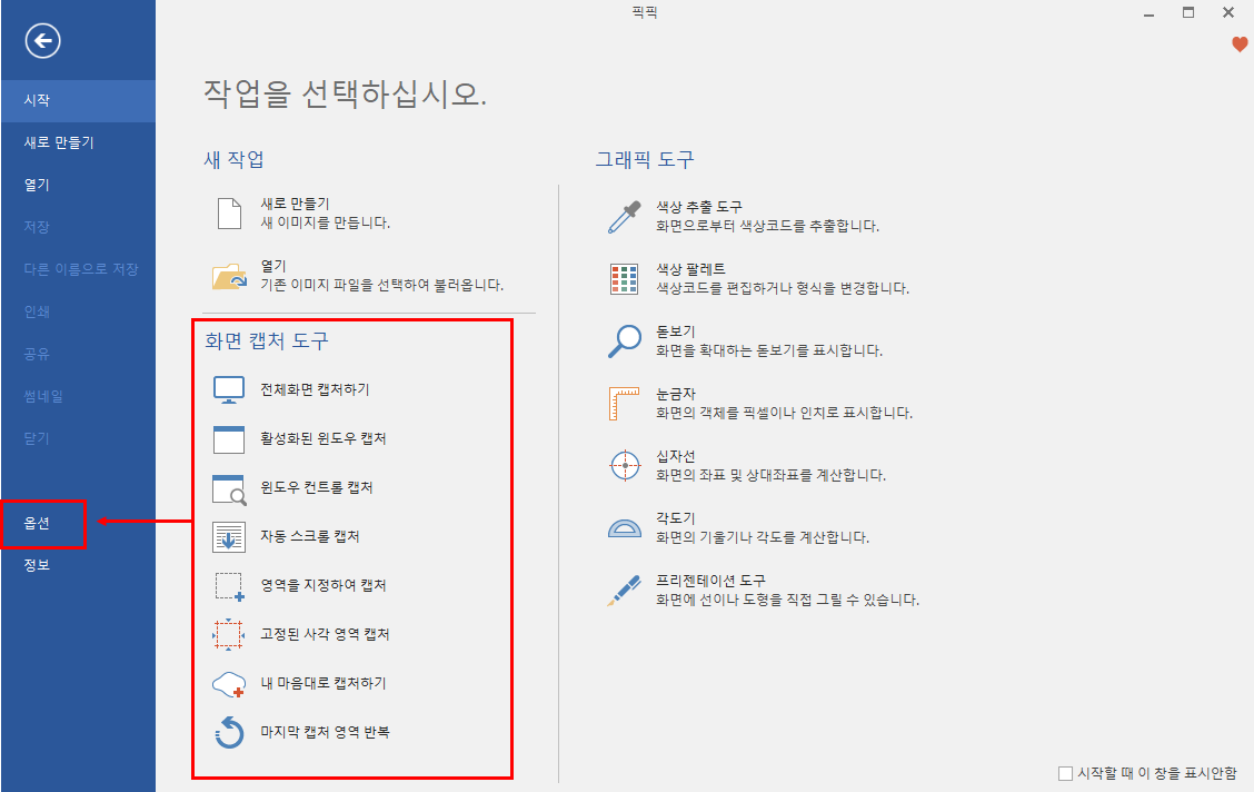 일단 위에 설명한 기능들은 픽픽 프로그램을 실행하면 첫 화면에 하나씩 나열되어 있습니다.