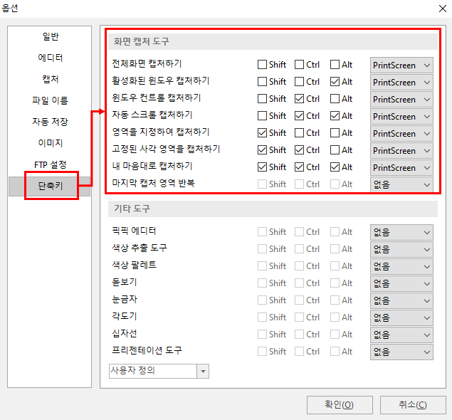 이 화면에서 단축키 버튼을 클릭한 뒤에 '화면 캡처 도구' 안에 있는 키들을 기억하거나 또는 내가 자주 사용하는 키로 변경해서 일부 기능만 빠르게 사용하시는 것을 추천합니다.