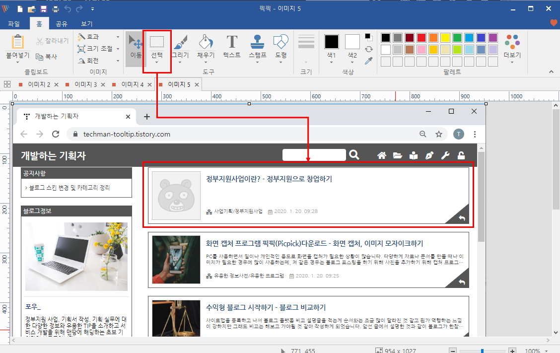 이 화면 캡처는 필요하고 이 게시글을 아직까지 공개하기는 싫다라고 생각해 모자이크를 넣고 싶다라고 하면 영역선택 버튼을 눌러서 내가 원하는만큼의 영역을 선택해주시면 됩니다.