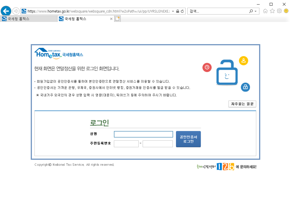 연말정산간소화 버튼을 눌러 페이지를 이동하게 되면 로그인 페이지가 나타납니다.