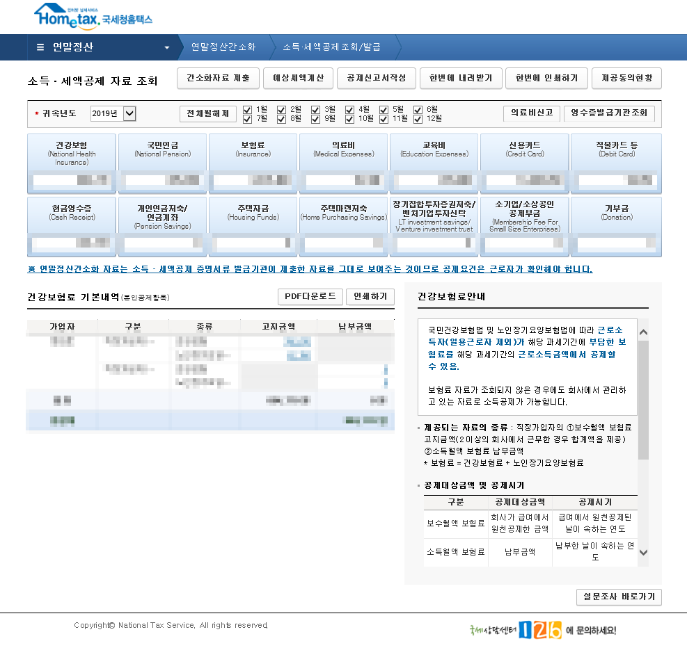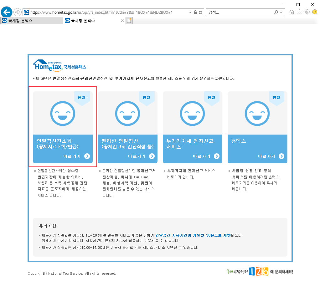 당장 20일 ~ 21일만해도 저녁이 아니면 원활이 떠있는 페이지를 못 본 것 같은데 지금은 별다른 접속 걱정 없이 사용할 수 있을 것입니다. (연말정산 기간에는 사용자들이 갑작스럽게 많이 접속하기 때문에 홈페이지가 자주 마비됩니다.)