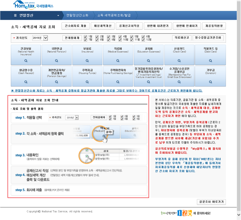 처음에 모든 항목에 대해서 돋보기 표시가 있고 금액 자체가 보이지 않게 되는데 여기서 왼쪽 하단을 보면 어떤 방식으로 소득, 세액공제 자료를 조회하고 선택해서 발급할 수 있는지 상세하게 설명이 되어 있습니다.