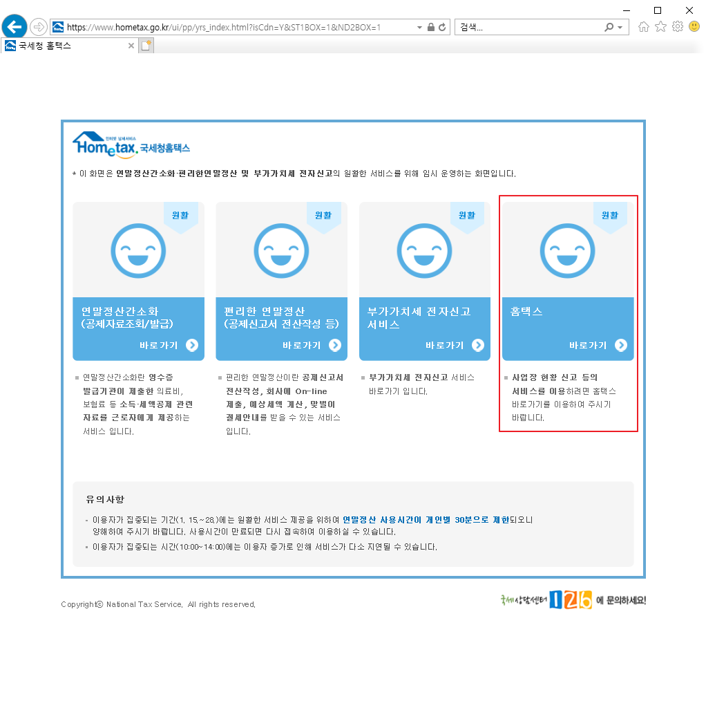지금은 연말정산 기간이라 아래와 같은 페이지가 나타나는데 여기서 '홈택스 바로가기'를 눌러주시면 됩니다.