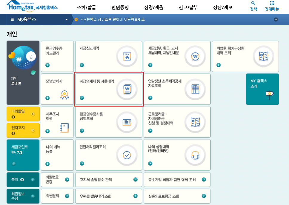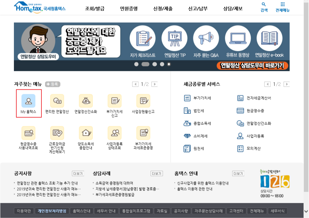이 화면에서 'My 홈택스' 버튼을 눌러서 페이지를 이동하시면 되겠습니다.