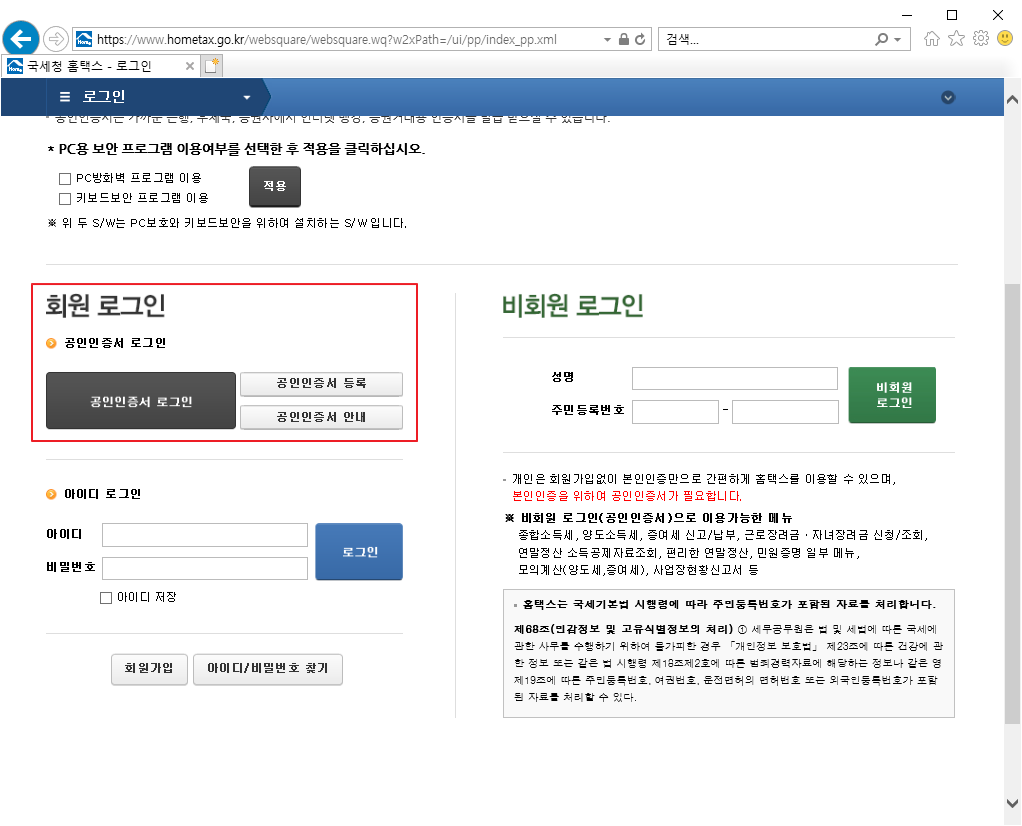 홈택스 홈페이지의 메인 화면으로 이동한 뒤에 로그인 버튼을 눌러 공인인증서로 로그인을 진행하시면 되겠습니다.